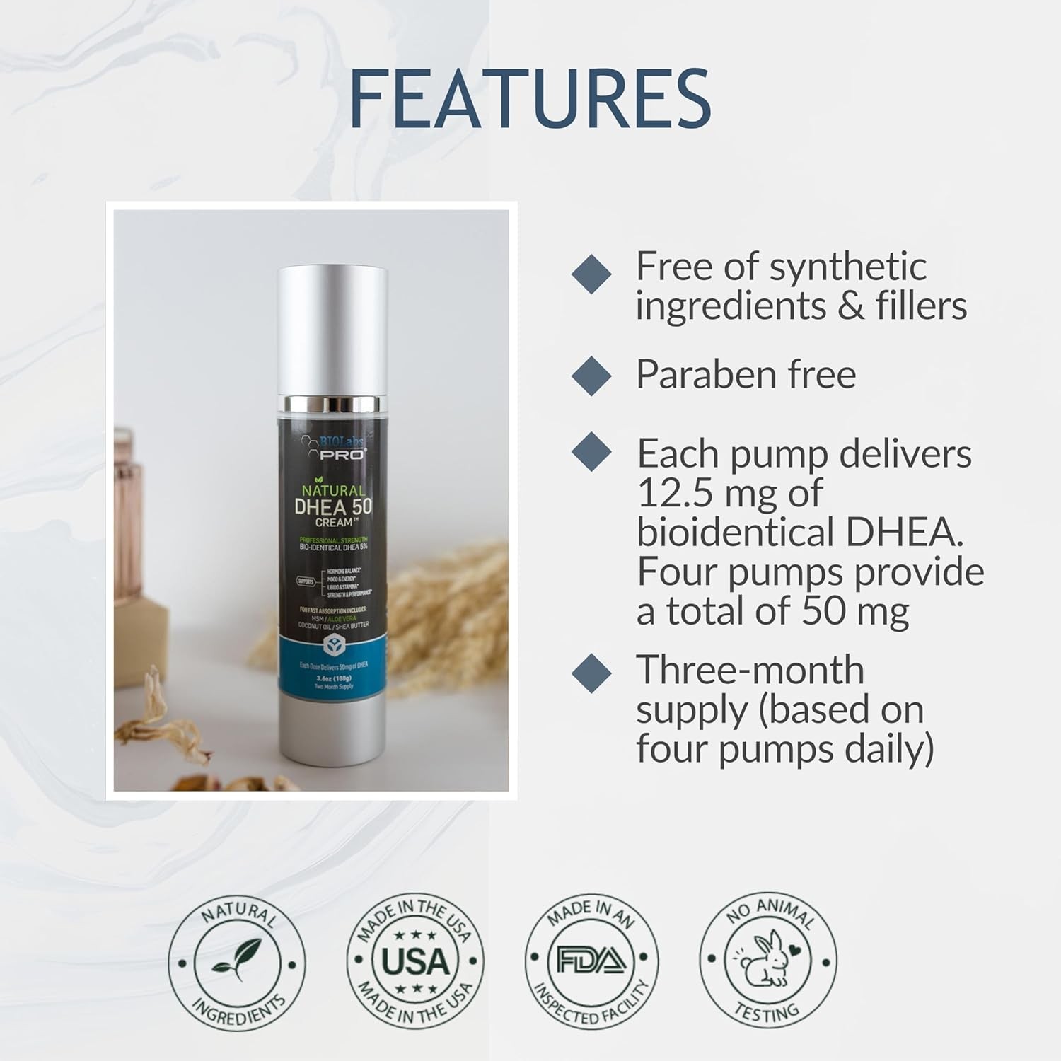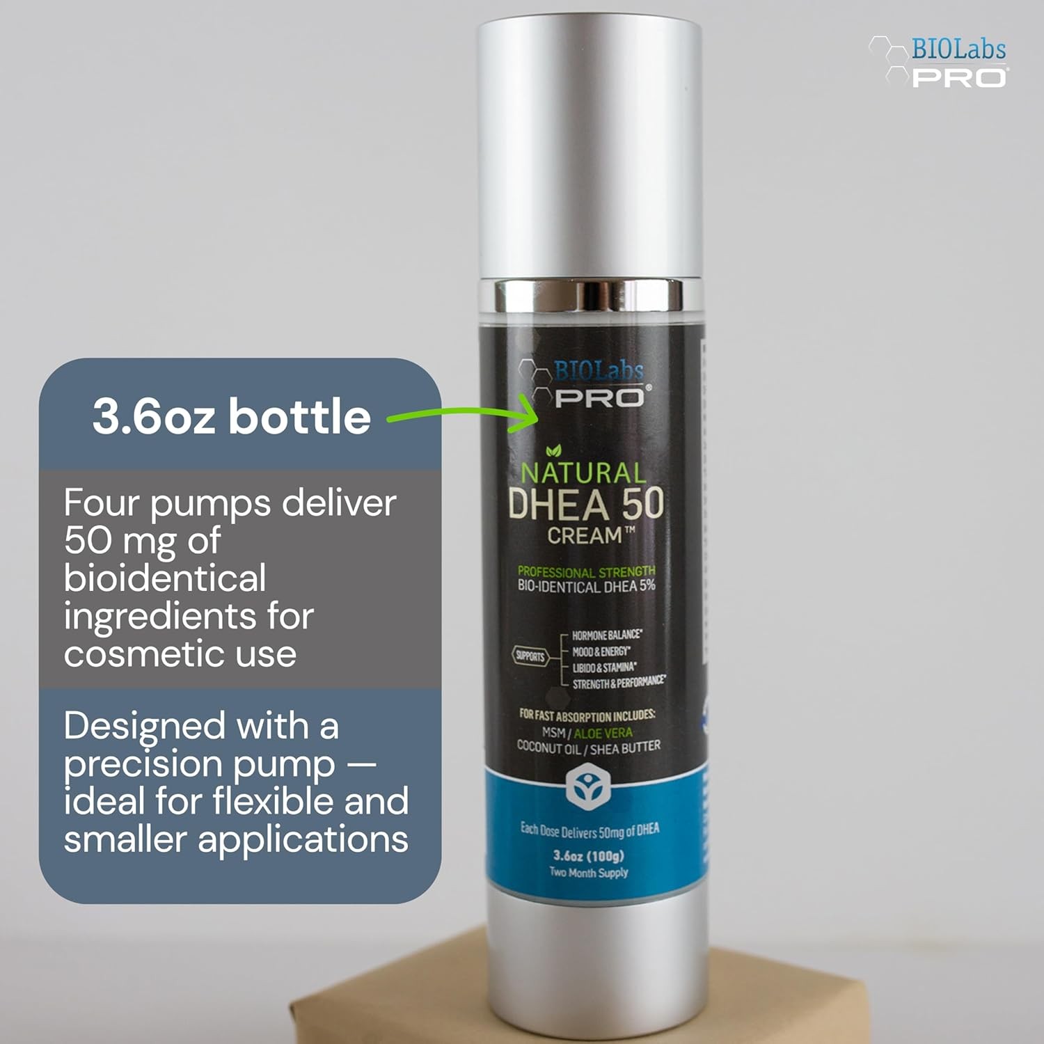 BIOLABS PRO Dhea Cream - Bioidentical Natural Dhea for Women Or Men - 50mg Per Dose - Three Month Supply - Luxury Bottle - 3.6oz