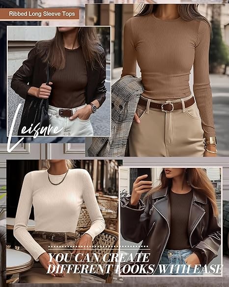 Ficerd 3 Pack Women's Ribbed Long Sleeve Tops, Crew Neck Slim Fit Undershirts Knit Basic Casual Stretch Layering Tee Shirts