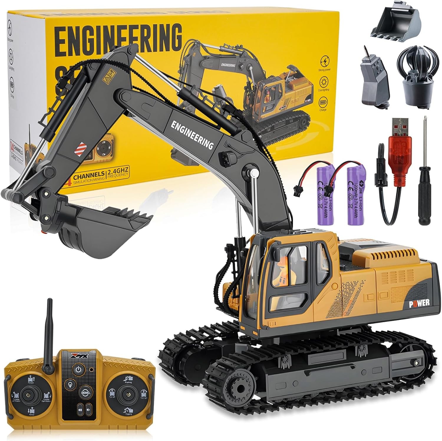 RC Excavator Toy for Boys 3-12, 3-IN-1 Bucket/Claw/Drill, 2.4GHz 14 Channel Construction Truck with 680°Rotating, 2400mAh Battery/LED Lights/Realistic Sounds, Durable Engineering Vehicle Gift for Boys